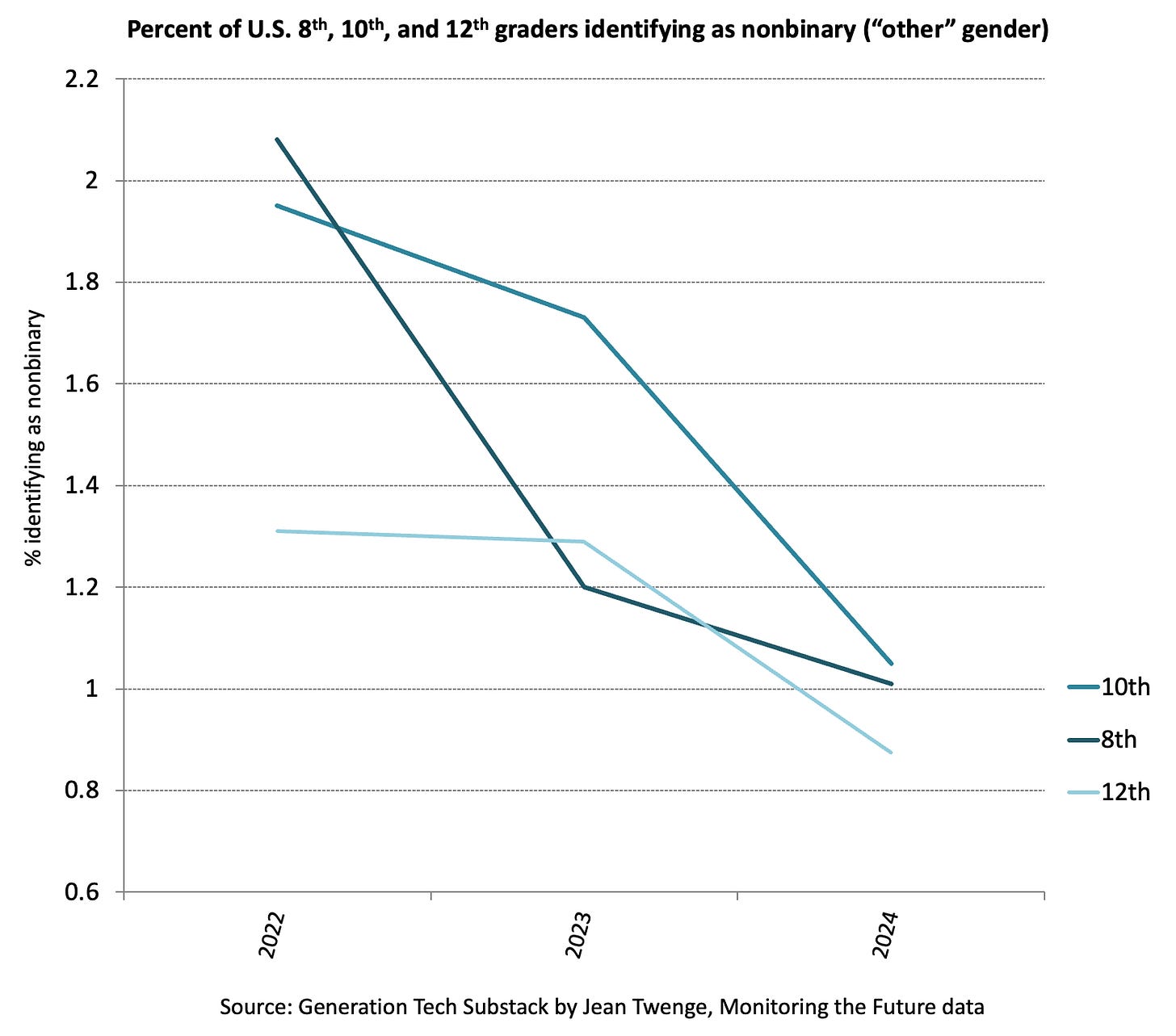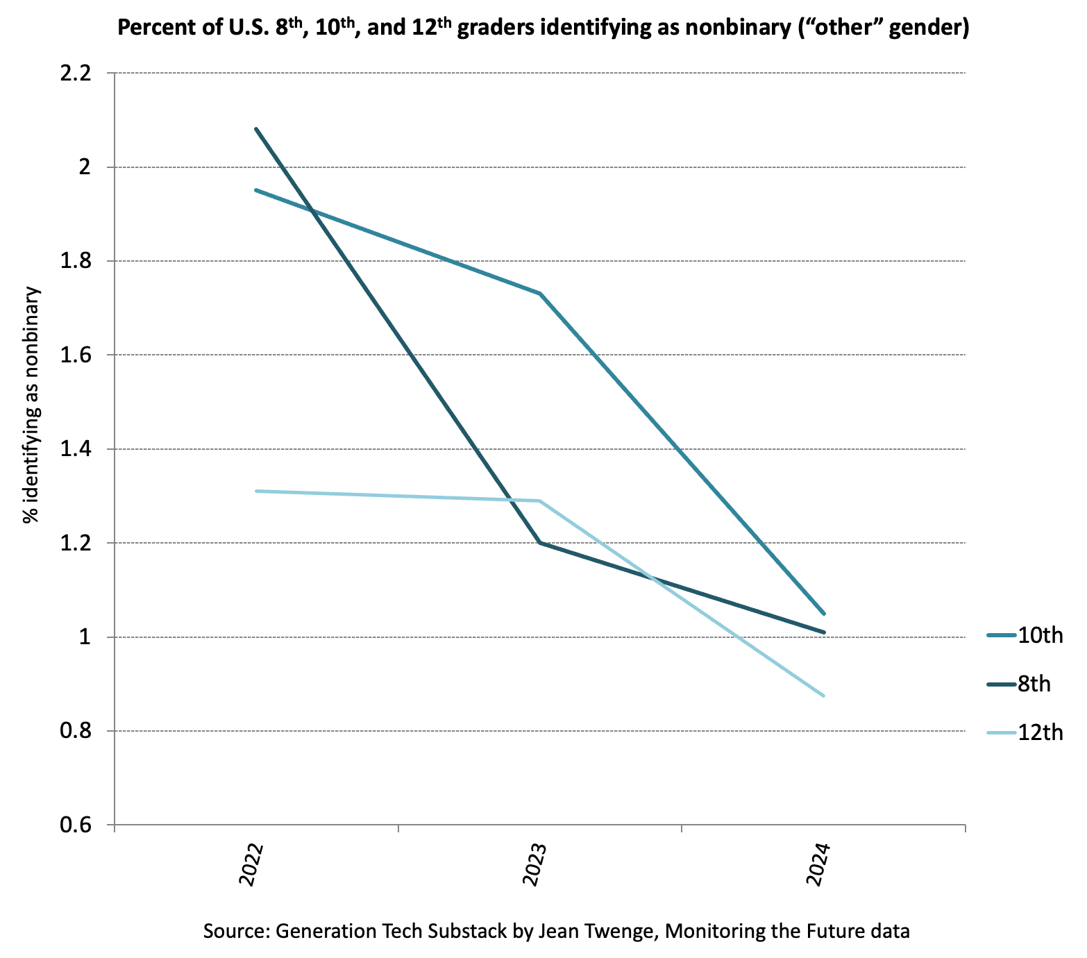 The results were unambiguous. Across all three grade levels, identifying as nonbinary plummeted between 2022 and 2024 (see Figure 1).