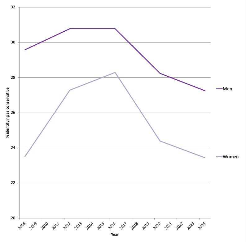 Figure 1: Percent of U.S. 18- to 29-year-olds who identify as conservative, presidential election years, 2008-2024. Source: Cooperative Election Study.