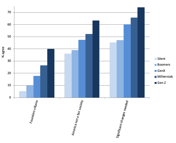 Three out of four Gen Z’ers believe that “significant changes” to the U.S. government’s “fundamental design and structure” are necessary. (As do the majority of Millennials and Gen X, which is also news). Nearly 2 out of 3 disagreed that “America is a fair society where everyone can get ahead.” Gen Z was also negative about the country’s past; 4 out of 10 said that the founders of the U.S. are “better described as villains” than as “heroes.” These are not the beliefs of a thriving democracy.