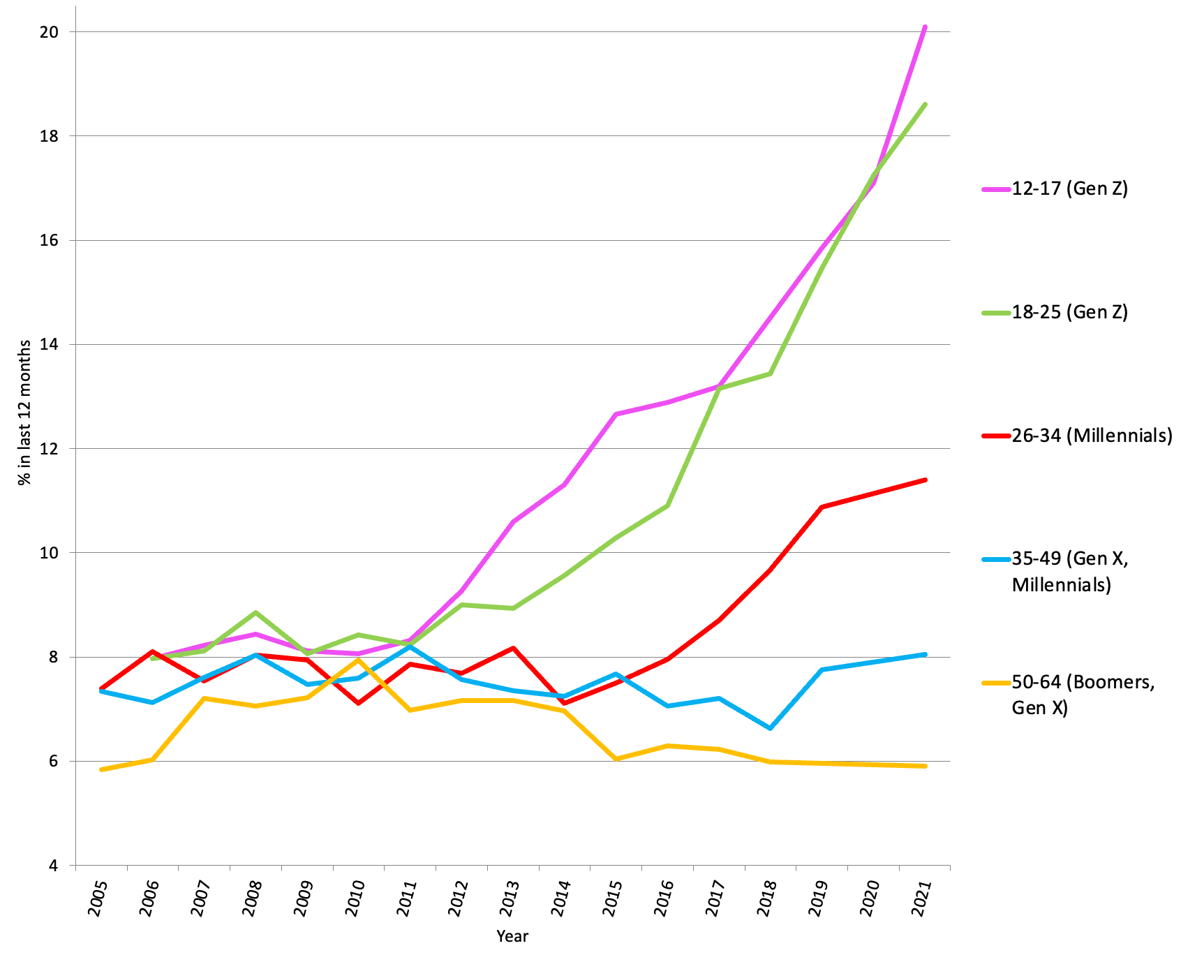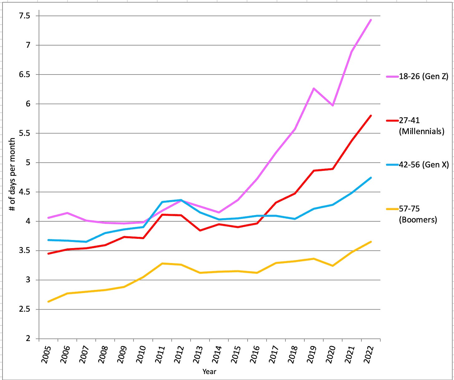 As more young adults (ages 18 to 26) shifted from Millennials to Gen Z, days of poor mental health increased. That’s consistent with other research finding increases in mental health issues among young adults since 2014 or so.