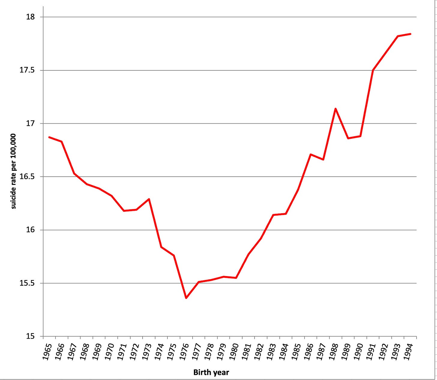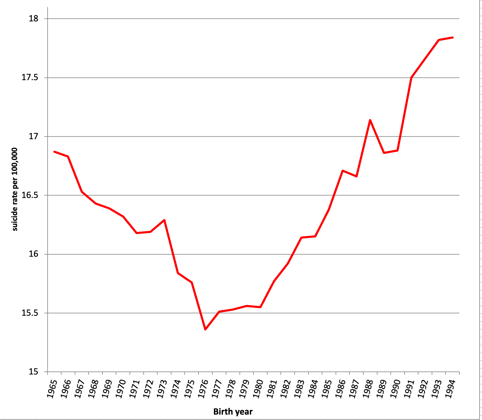 The changes in the suicide rate are especially striking. When I was working on Generations, I put the suicide rates for people of different ages during different years into a big datafile and had it output the suicide rate for each birth year controlled for age. That gives a view of suicide rates across generations apart from age differences.