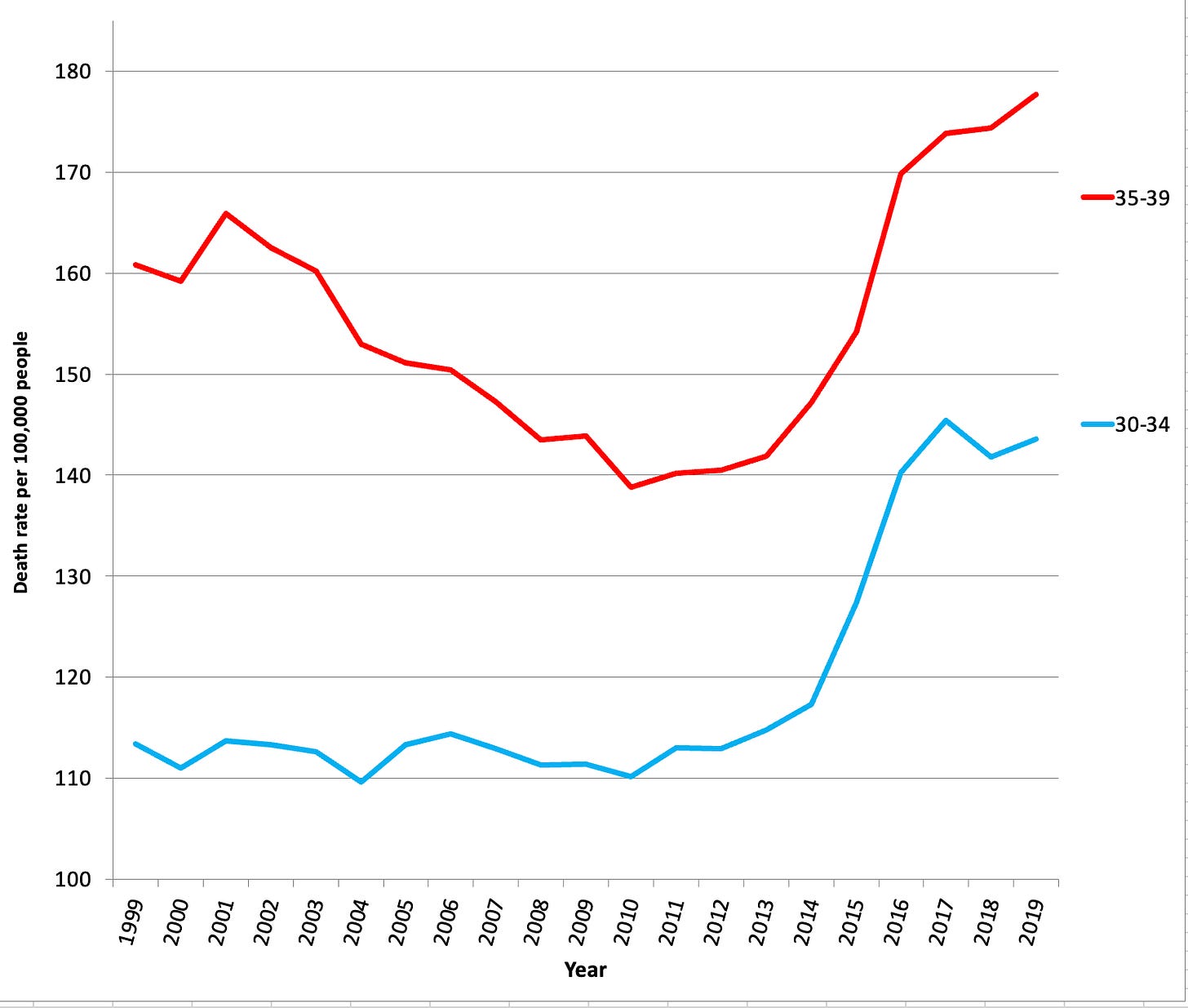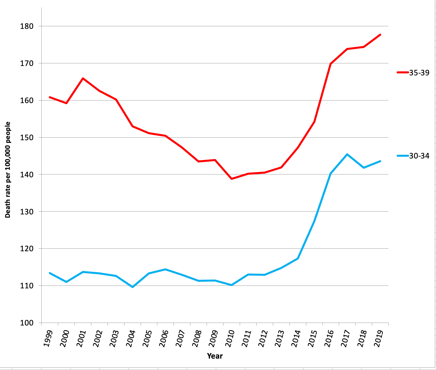Sadly, it gets worse. In a well-known paper, Case and Deaton (2015) showed that death rates increased among middle-aged Boomers between 2000 and 2015. When working on Generations, I was startled to find that the trend now extends to younger adults: Death rates for adults in their 30s (all Millennials since 2018) were considerably higher in 2019 than they were 15 years before when this age group was all Gen X’ers. And this was before the COVID-19 pandemic hit in 2020 and brought up death rates — this analysis ends in 2019 (see Figure 3).