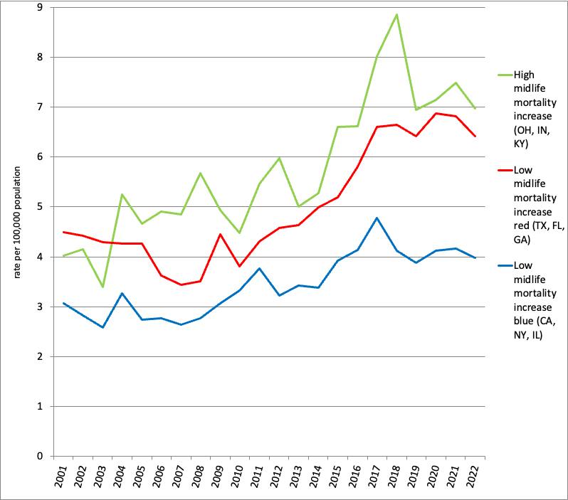 We can also examine teen suicide rates by state as long as their populations are large enough (when raw numbers are too low, the CDC does not report suicide data). For the states with the largest increases in midlife mortality, that’s Ohio, Kentucky, and Indiana. We can compare those to the highest-population states with low or no increases in midlife mortality: California, New York, and Illinois. However, we’re then comparing a group of three red (Republican-leaning) states with three blue (Democrat-leaning) states, and that may introduce confounds, especially with a statistic like suicide that might be influenced by state policies and regional cultures, such as access to guns or state funding for mental health interventions. Thus it might be wise to also include a group of red states with smaller or no increases in midlife mortality. The three with the highest populations are Texas, Florida, and Georgia.