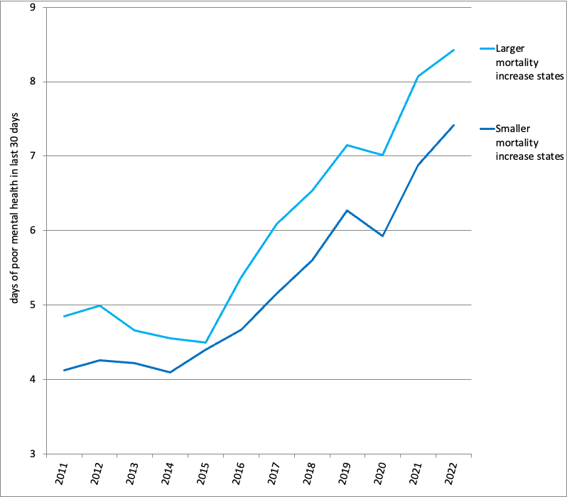 Most surveys don’t report data state by state. One of the few that does, the CDC’s Behavioral Risk Factor Surveillance System, asks U.S. adults about days when people feel “stress, depression, and problems with emotions.” Among young adults, poor mental health increased at the about same rate in states with smaller vs. larger increases in midlife mortality (see Figure 4). This suggests a cause other than rising deaths among the middle-aged.