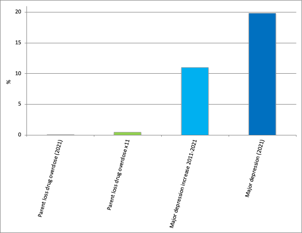 The Schluter paper estimated that about 100 children out of 100,000 lost a parent to a drug overdose in 2020. Using a different model, the Jones paper put the estimate at 63 children out of 100,000 in 2021. Both are less than .1% (1 out of 1,000) of children a year. Even if we assume that every child who loses a parent goes from not depressed to depressed and multiply the estimates over the 11 years of the increase in teen depression, the number of teens affected is still less than 1%. With teen depression rates rising from 8% in 2011 to 20% in 2021, the primary cause must be something impacting a much larger number of teens. The numbers aren’t even close (see Figure 1).