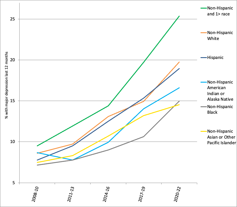 Figure 3: Major depressive episode among 12- to 17-year-olds, by race and ethnicity. Source: National Survey on Drug Use and Health. Note: Years are combined to increase sample size within racial and ethnic groups.