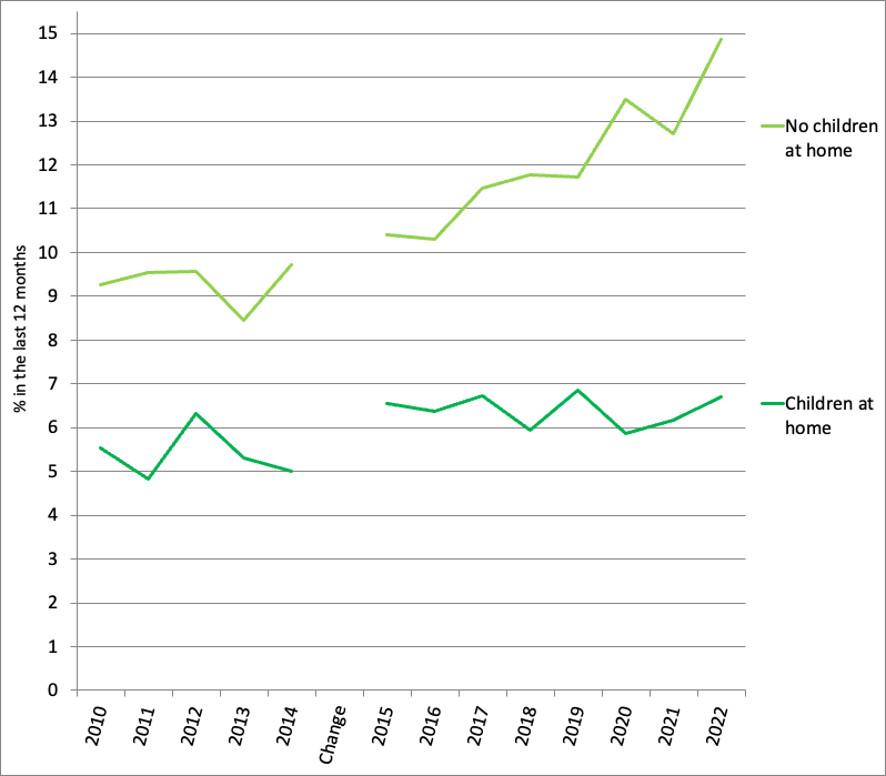 Figure 6: Percent experiencing major depression in the last year, by age group and presence of children. Source: National Survey on Drug Use and Health.