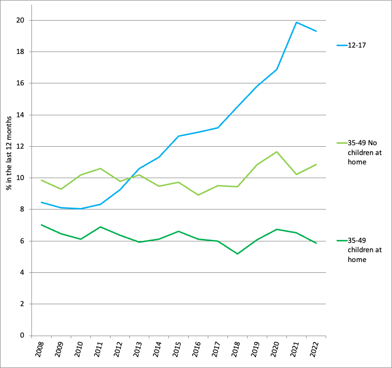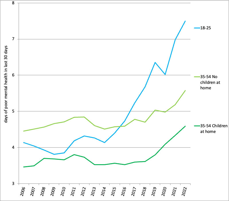 What about more low-level stress? Here, we finally see some evidence of issues among middle-aged parents, but with two big caveats. First, the increase in stress among parents pales in comparison to the huge spike among young adults (see Figure 7). Second, the rise for parents began only during the pandemic years after 2019, making it an unlikely cause for the rise in teen depression that began in 2012. And, even with the pressures on parents during the pandemic period, they experienced fewer days of poor mental health than their peers without children at home.
