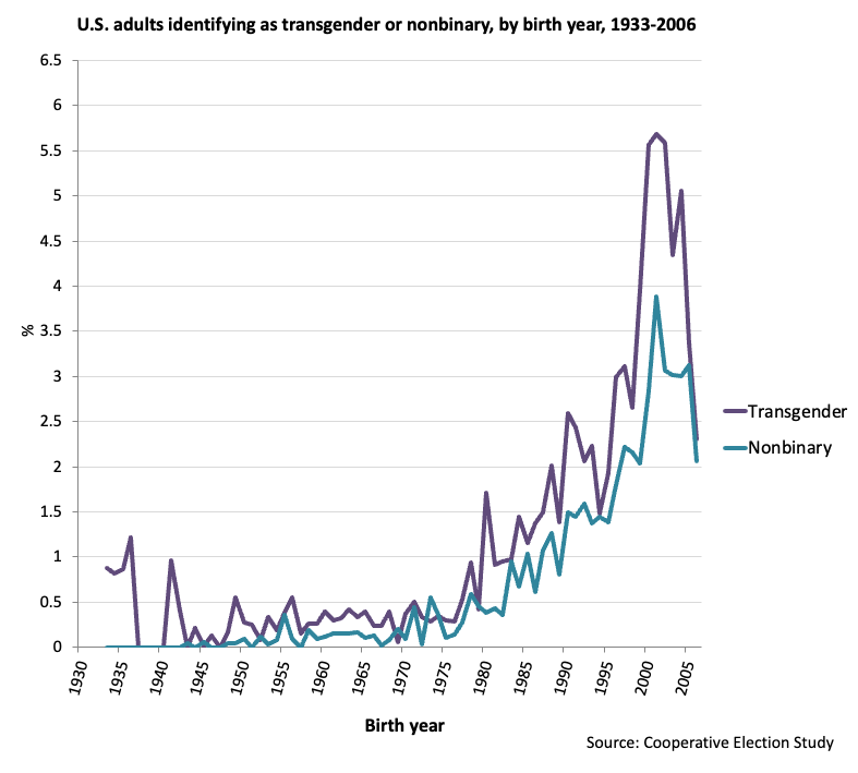 Figure 3: Percent of U.S. adults who identify as transgender or nonbinary, by birth year, 1933-2006. Source: Cooperative Election Study. Note: Transgender identity was not assessed in 2023. Data are weighted. Analyzed by Jean M. Twenge for the Generation Tech Substack.