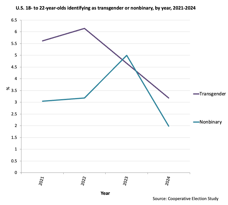 Then, over the weekend, I found it – a nationally representative survey that asked about transgender identification in the same way from 2021 to 2024. It also asked separately about identifying as nonbinary.