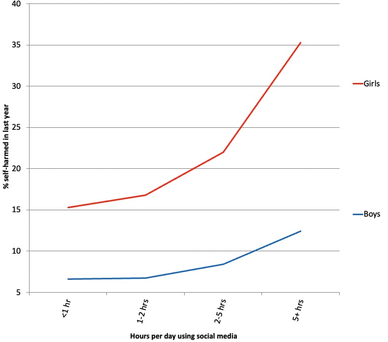 Figure 2: Percent of adolescents reporting having self-harmed in the last year by hours per day of social media use and gender, UK Millennium Cohort Study. Source: Twenge & Farley (2021)