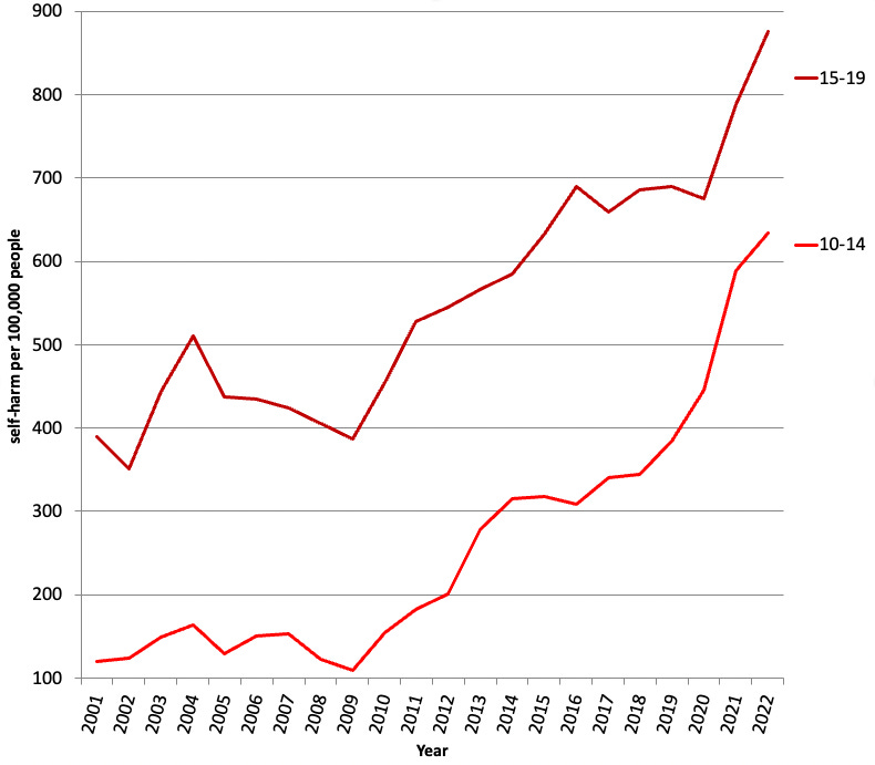Figure 1: Emergency department admissions for self-harm, U.S. girls and young women, by age group, 2001-2022. Source: U.S. Centers for Disease Control WISQARS database